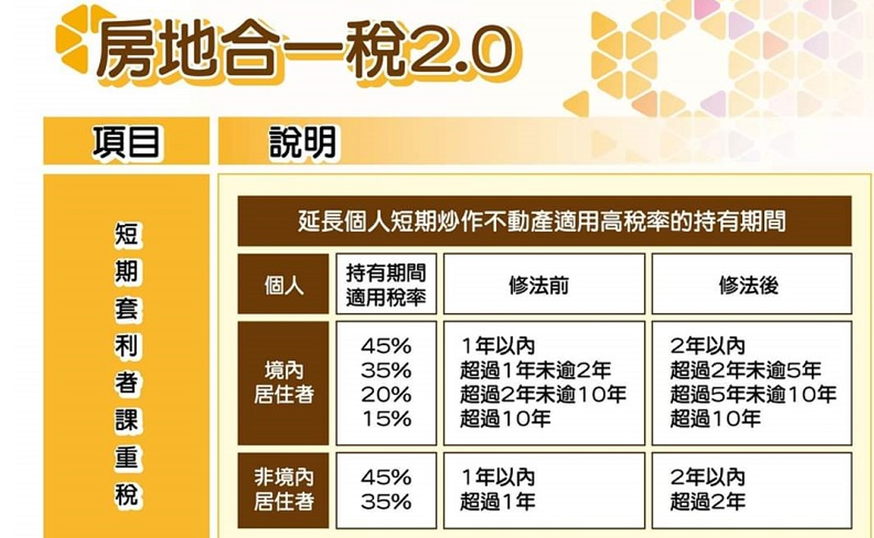 房地合一稅的出現,主要是政府為打擊房地產投資客短期炒作房地產,短期套利,造成整體房地產市場價格不正常的上漲,讓實際需求者的購屋成本增加,導致人民壓力指數上升,進而引發社會問題,因此政府於民國105年1月1日開始實施房地合一稅1.0版,只要於105年1月1日後所取得之房地產,未來出售獲利之部分,以房地合一稅制課徵稅收,反之,於105年1月1日前所取得之房地產,則以房地分離方式課徵稅收。有關房地合一稅制度中,房地持有時間越久,則稅率越低,進而能降低投資客短期炒作房地產,也能健全整體房市。