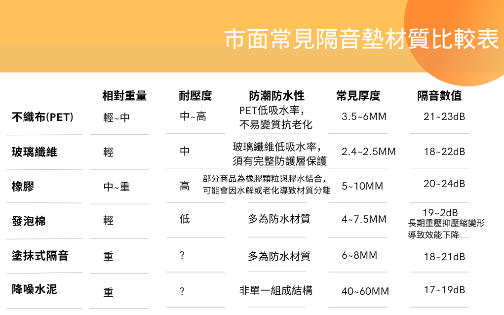 表格內的材質比較(重量、耐壓、防潮防水性、厚度、隔音數值等)可協助業界了解其特質並選出更合適的材料。